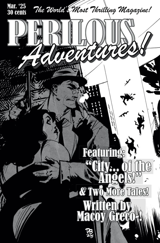 More than a throwback, Perilous Adventures! trades in new twists on classic images and old stories that veer into the unexpected—- all in beautiful black and white! Curated by Macoy Greco, and drawn by young up-and-coming artists, to excite, delight, and startle our readers. After all, we are the world’s most thrilling magazine!